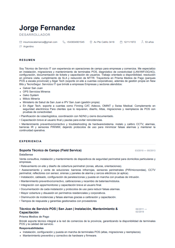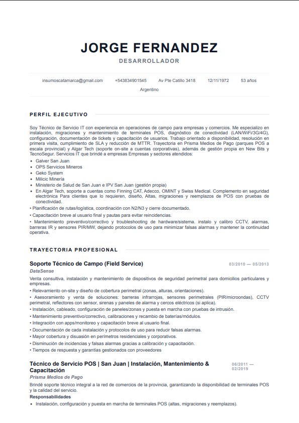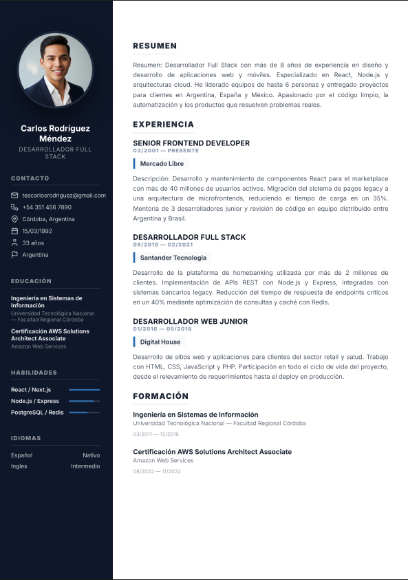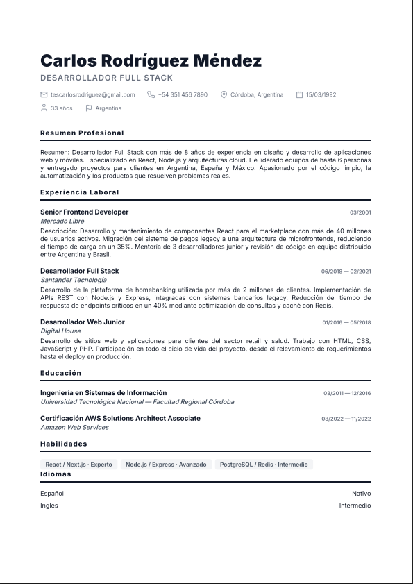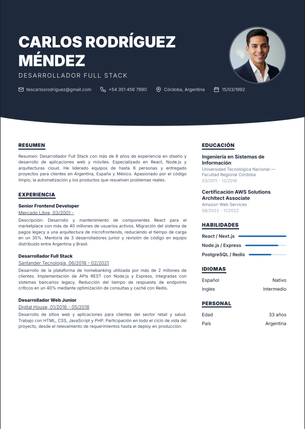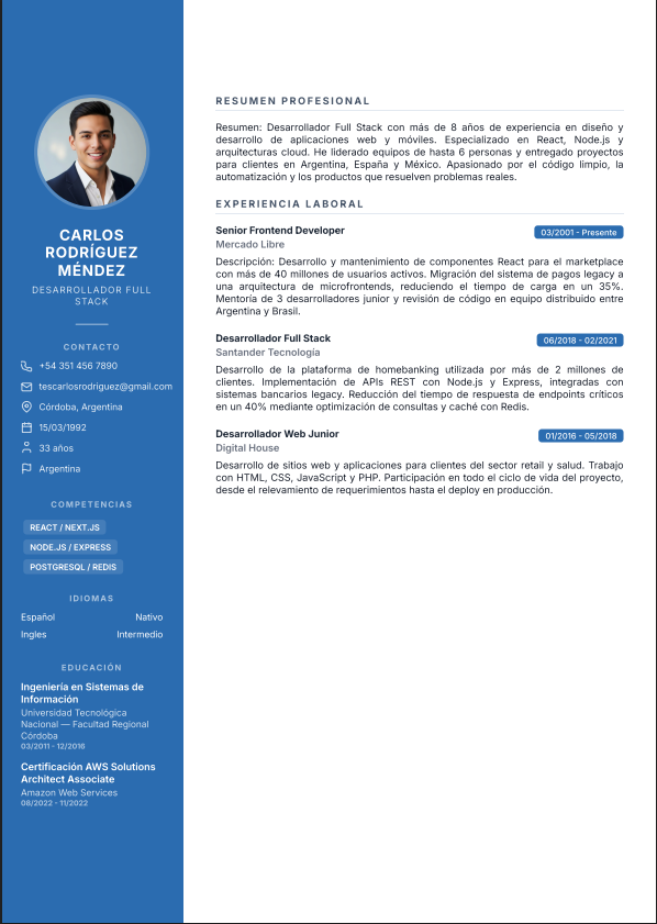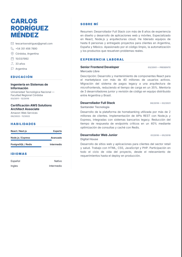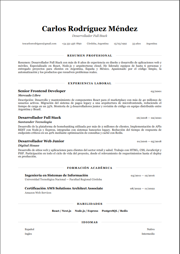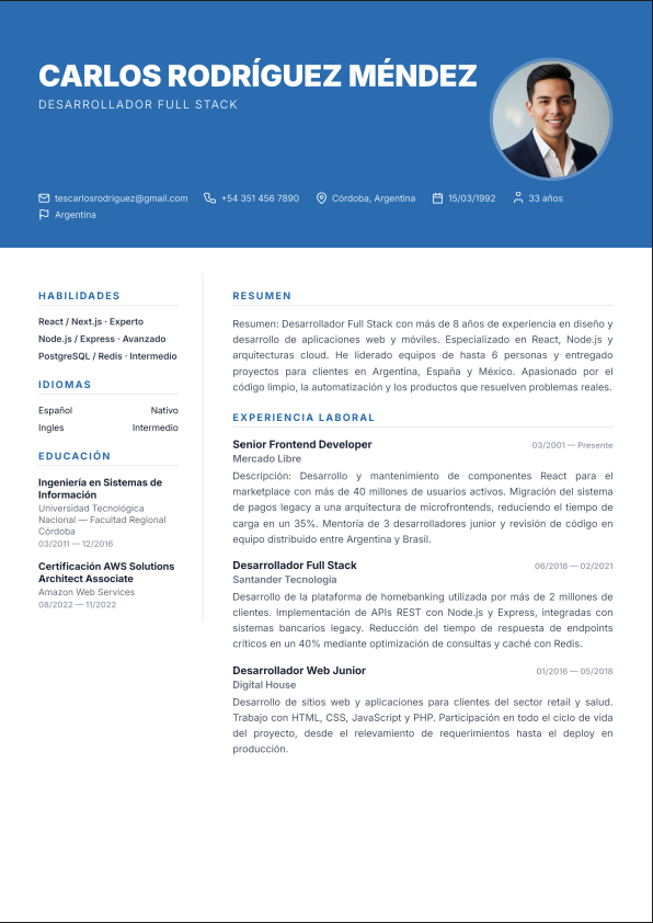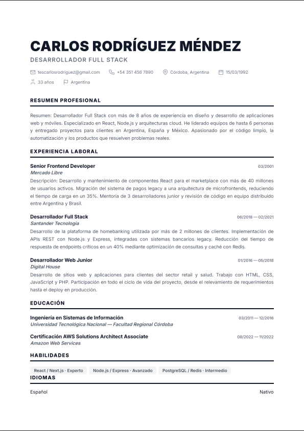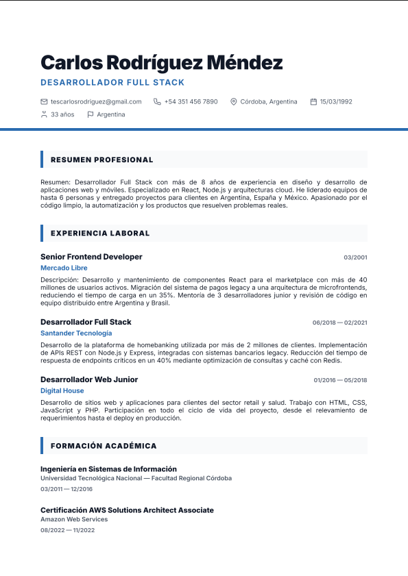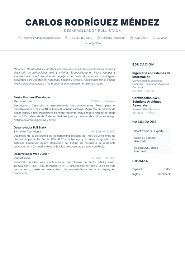 Máxima compatibilidad ATS con una estética limpia y eficiente.