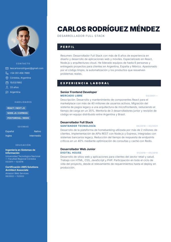 Sidebar de doble impacto con jerarquía clara para perfiles con mucha experiencia.